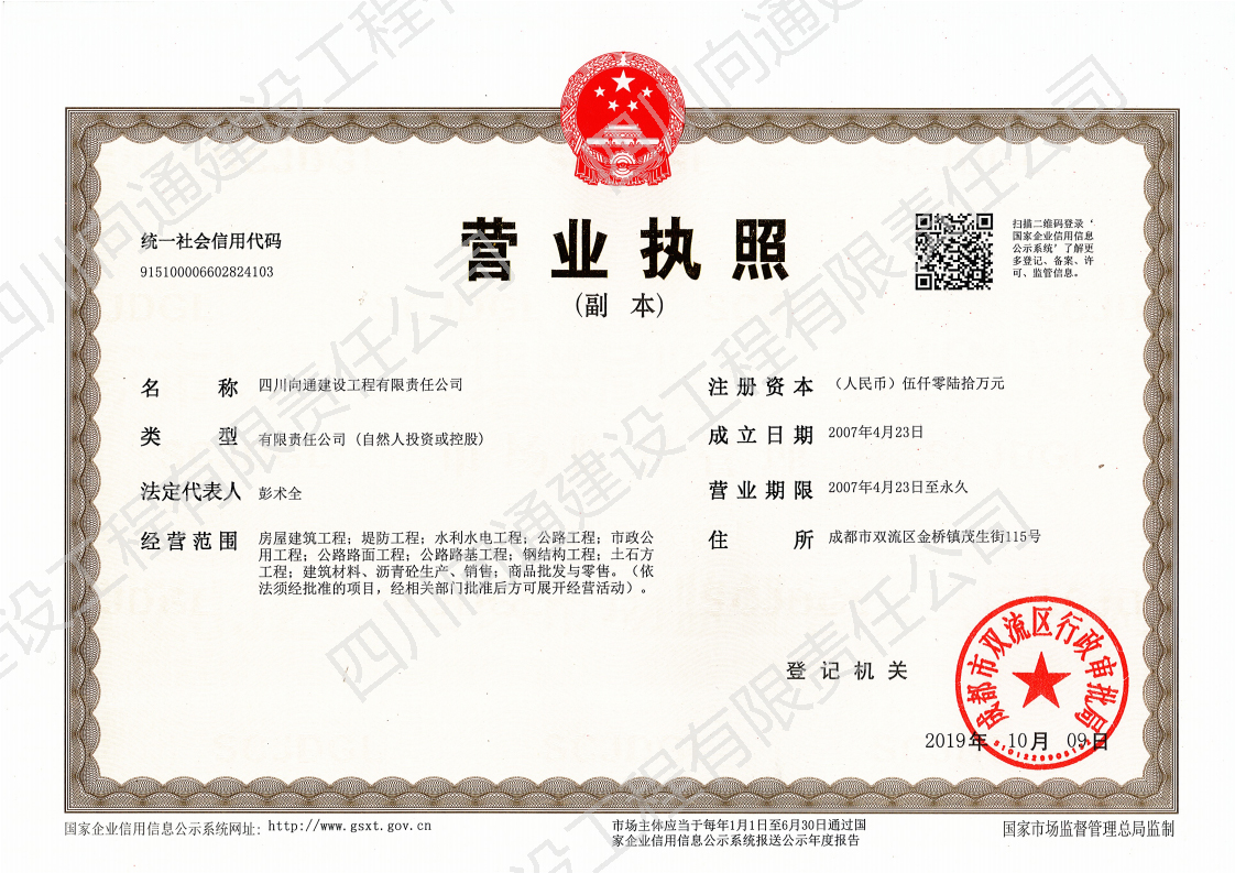 四川向通建設工程有限責任公司 四川向通建設工程有限責任公司成立于2007年,注冊資本金5060萬元,是一家專業從事瀝青混合料生產、專業分包以及市政道路、公路、路基工程專業施工建設的企業。公司注冊地址及生產廠區位于成都市雙流區金橋鎮茂生街115號,總占地面積約120畝;辦公地址位于雙流區海濱城海濱廣場7座11樓。公司生產廠區(雙流金橋)現有LB-5000型瀝青混合料拌合樓1套,每小時瀝青混合料生產量可達380噸。此外,根據項目需要,公司在多地建立4000型拌合站以服務施工(廣安齊福、達州、綿陽等),每小時瀝青混合料生產量為320噸。各種國內外道路施工機械:攤鋪機、壓路機、銑刨機、灑布車、封層車、吊車、拖車、等70余臺,可滿足各種道路施工需求。公司近100輛保溫運輸車輛均安設保溫板、加塞保溫棉、覆蓋棉絮和隔熱防水雨篷,有效減少瀝青混合料在運輸過程中的溫度流失進而保證瀝青路面的施工質量。 公司目前擁有眾多優秀的技術人才,成熟的市場渠道,良好的企業聲譽。現有各專業施工人才共計79人;5支專業的施工班組可根據現場的具體情況制定實施性施工方案。今后公司將竭誠為各界客戶提供出色的產品和服務及具有競爭性的價格和具有創新精神的高效解決方案。 公司曾經榮獲:新津鄧雙段被新津縣政府評為“優良工程”;雙流宗申大道被雙流縣政府評為“優良工程”;成都后花園被成都市政府評為“重合同守信譽單位”;被三一重工評為“有遠見單位”。并在2018年1月被中國五冶集團評為“優秀供方”;同年3月被四川交投評為2017年度“優秀合作單位”的榮譽。榮譽的背后是我們公司所有員工堅持不懈的努力。 作為現代化的企業,公司將以技術為切入點,以信譽為支撐點,以市場為著眼點,促進管理創新和技術創新。因此我公司能在短時間內迅速發展成為一家擁有各類中大型施工機械設備的公司。在今后的工作中我們將借用現代電子信息溝通的便利為公司的發展助力,同時將秉承發揚以往的團結拼搏精神,推動公司成為“快穩型”發展的企業。 在未來的發展過程中,四川向通始終秉承“以質量求生存,以信譽求發展”的企業管理理念,以“啟后為先創佳績,爭做路建行業標”的企業宗旨與建設單位建立合作關系,創造更加輝煌燦爛的明天! 四 川 向 通 建 設